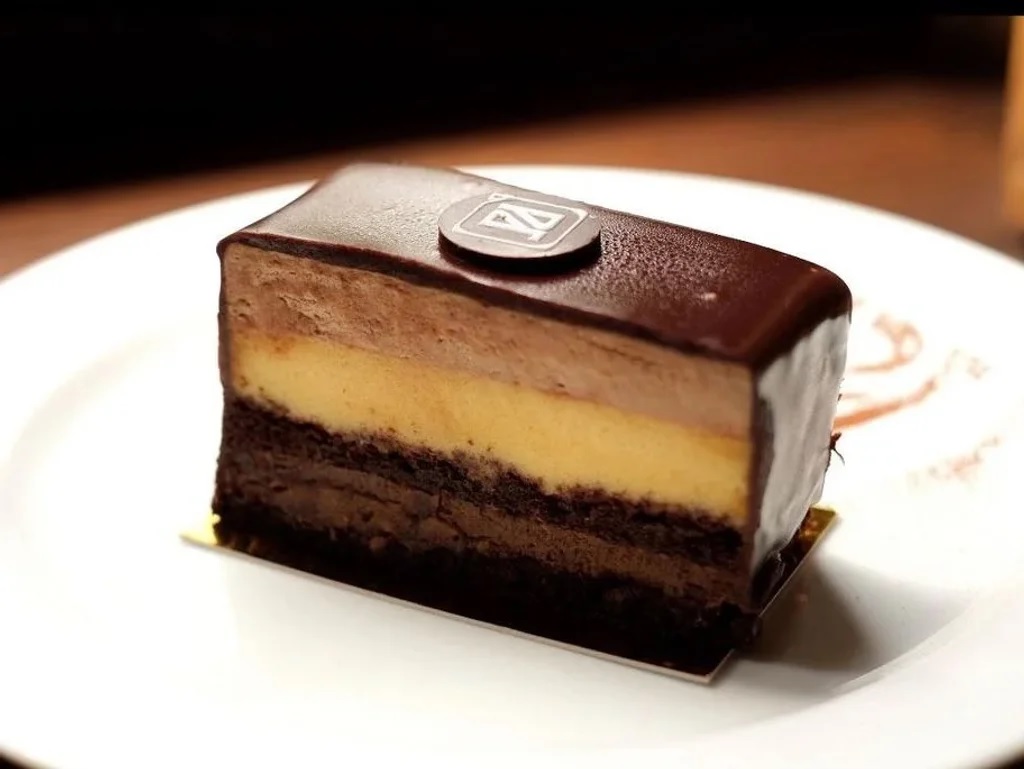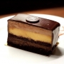 (buttery tender biscuit with rum syrup, fruit-yoghurt and chocolate-yoghurt cream, in chocolate glaze)