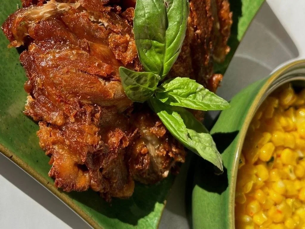 Baked duck with spicy corn stewed in butter